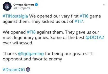 咱们正在TI6的第一场逐鹿便是对阵LGD。TI7是他们镌汰了咱们。TI8的首场对阵也是他们。他们给了咱们最具传奇颜色的逐鹿。他们是咱们睹过的最好的dota2选手。谢谢LGD,你是咱们最大的敌手NG南宫28官网登录,也是咱们最爱的冤家◆!DQw中邦电竞网