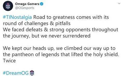 八月依然过了一半众余,假使没有疫情,现正在咱们该当享用着TI的盛宴。固然裁撤了TI,但动作TI两连冠的战队OG来说,正在熟谙的工夫用照旧炎热的状况参与着OMEGA联赛。赛场除外,OG的官方社交媒体账号也没有闲着,他们回头了OG战队不服淡的TI道程。从TI6拿下小组第一之后被连输两个Bo3黯然退场,再到TI9二度登顶称王,睥睨全邦。OG向咱们解释了抗拒的意志和团队的告成。